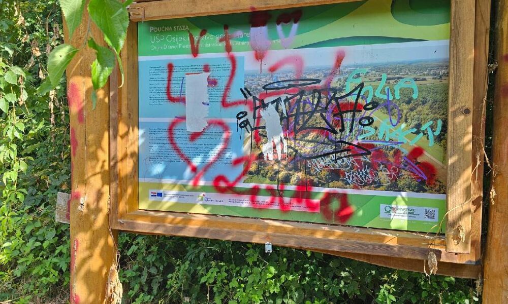 Porazbijana stakla na info panoima, ponegdje otkinute daske, poruke ispisane auto lakom...