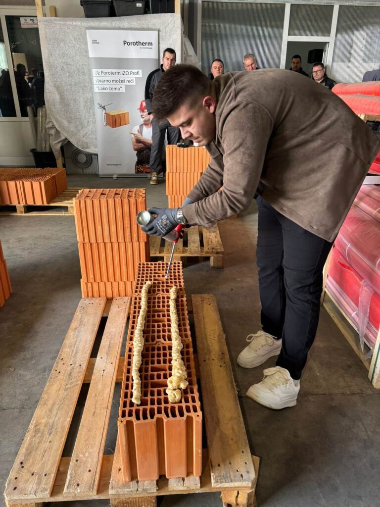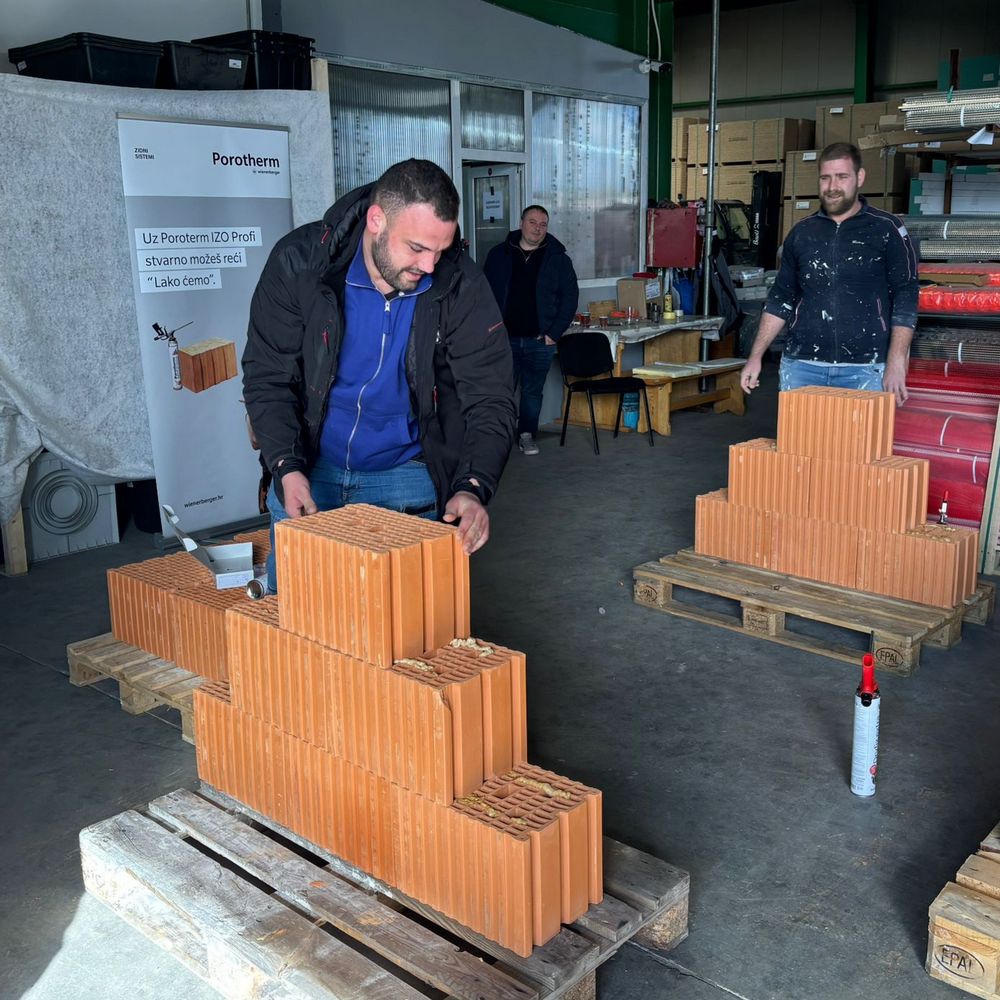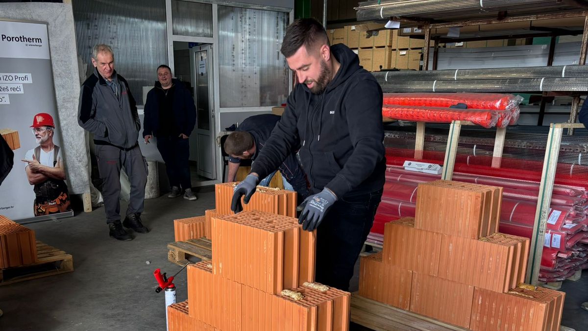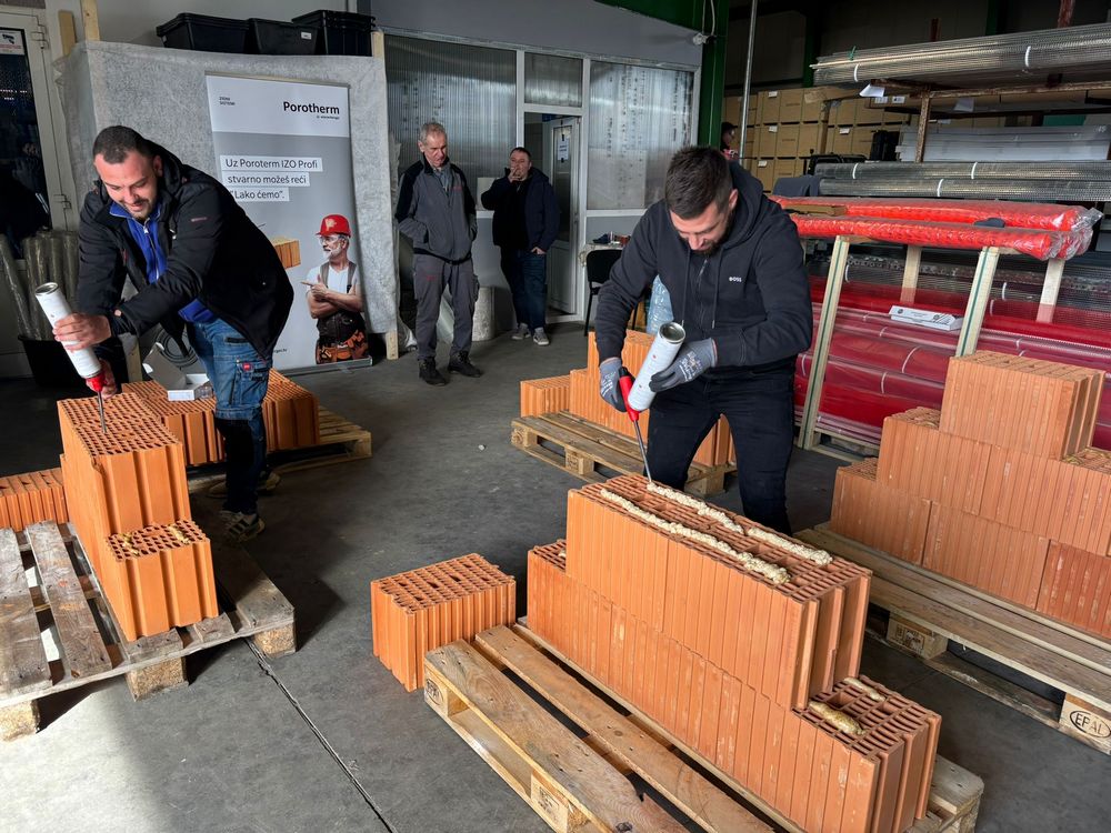 Sva trojica majstora prijavljenih za natjecanje u gradnji zida Wienerbergerovim sustavom Porotherm Profi uspjeli su šest blokova poslagati i učvrstiti poliuretanskim ljepilom Dryfix za manje od minute! Bilo je to finale praktičnog dijela usavršavanja u Izolirkinom edukacijskom centru, a nijanse od nekoliko sekundi razlike u brzini dobrovoljaca još su fascinantnije kad se uzme u obzir da su se sva trojica s tim sustavom gradnje susreli praktički prvi puta.