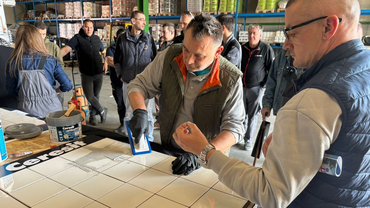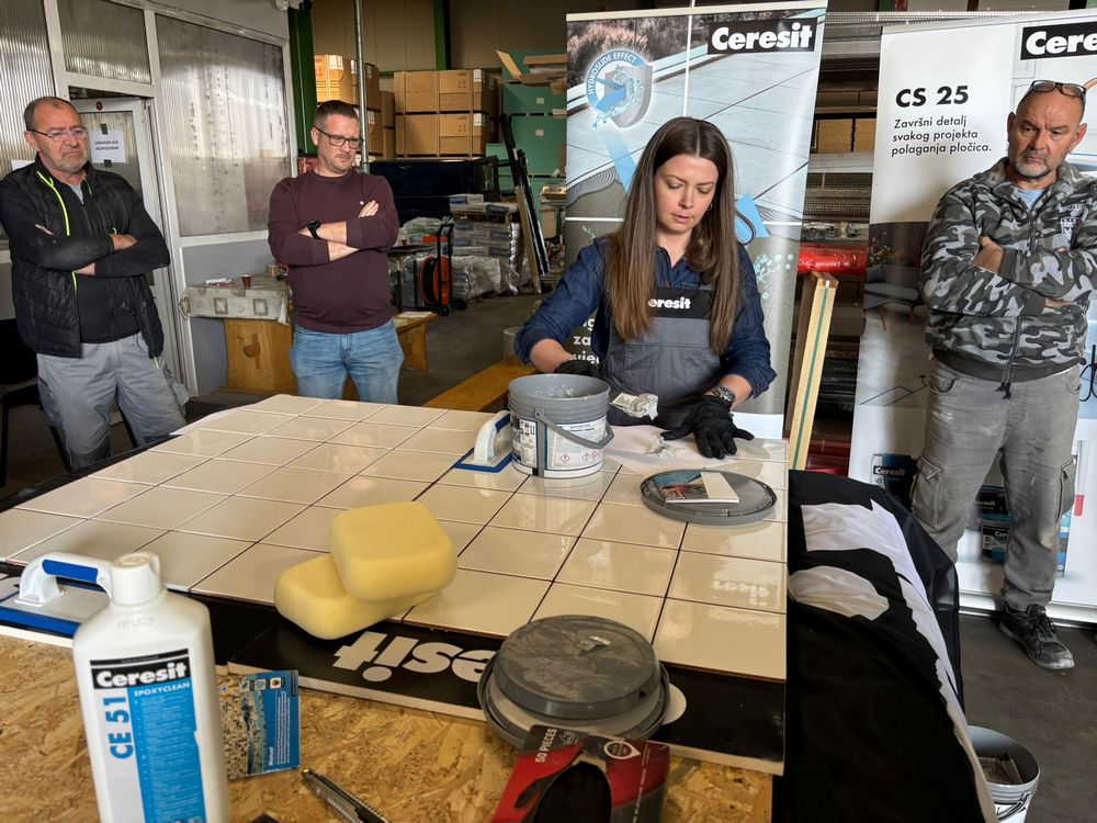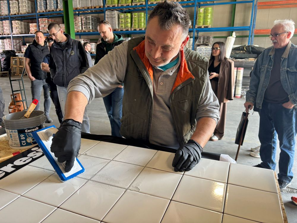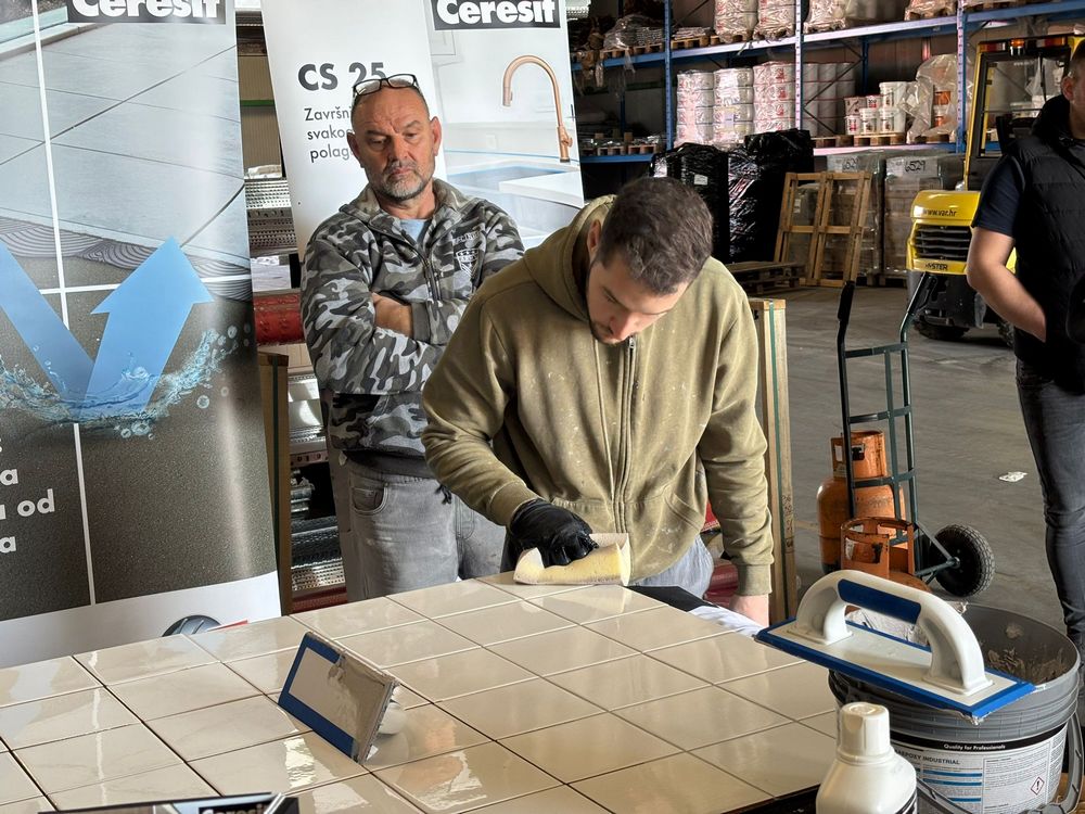 U jednom trenutku za radnim stolom Izolirkinog Edukacijskog centra nije bilo slobodnog mjesta jer su svi majstori željeli praktično isprobati rad s Ceresitovim dvokomponentnim epoksidnim materijalima CE 79 UltraEpoxy Industrial i CE 89 UltraEpoxy Premium, koji se mogu koristiti i za fugiranje i za lijepljenje keramičkih pločica i mozaika.