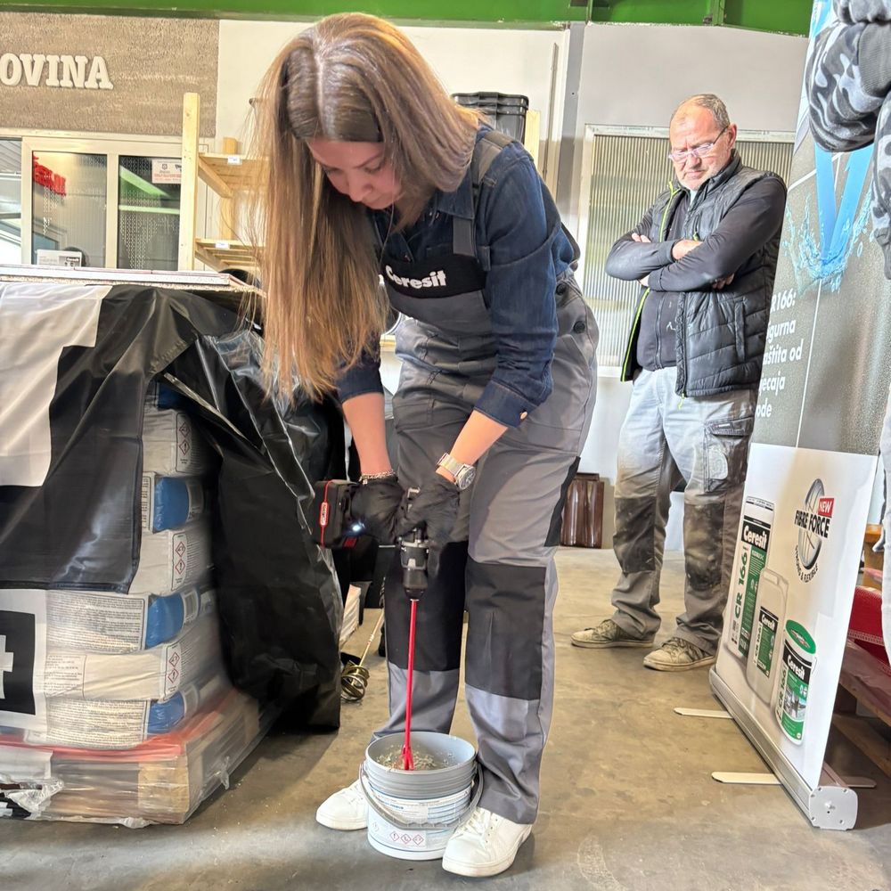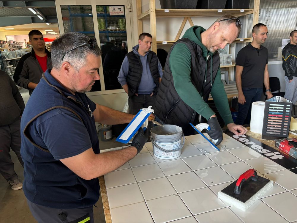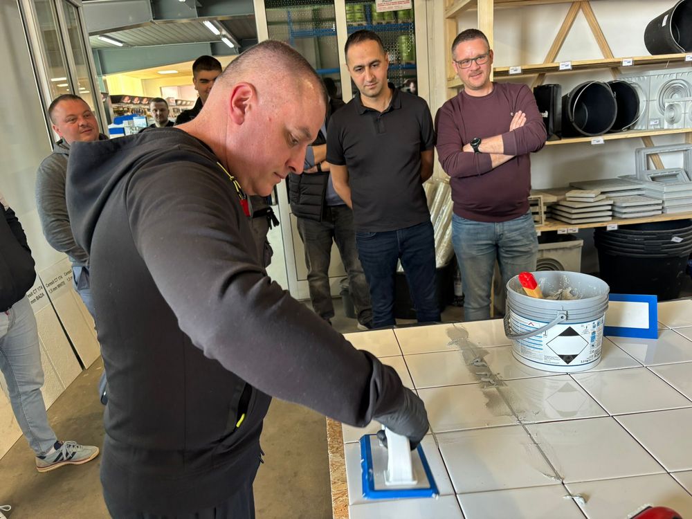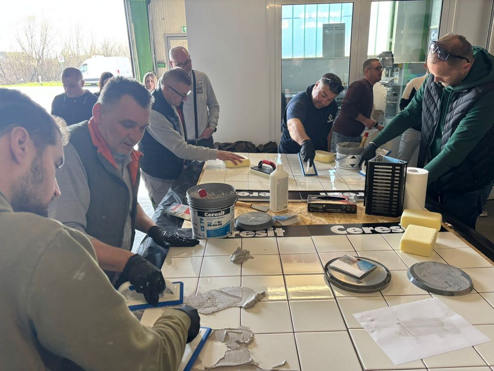 U jednom trenutku za radnim stolom Izolirkinog Edukacijskog centra nije bilo slobodnog mjesta jer su svi majstori željeli praktično isprobati rad s Ceresitovim dvokomponentnim epoksidnim materijalima CE 79 UltraEpoxy Industrial i CE 89 UltraEpoxy Premium, koji se mogu koristiti i za fugiranje i za lijepljenje keramičkih pločica i mozaika.