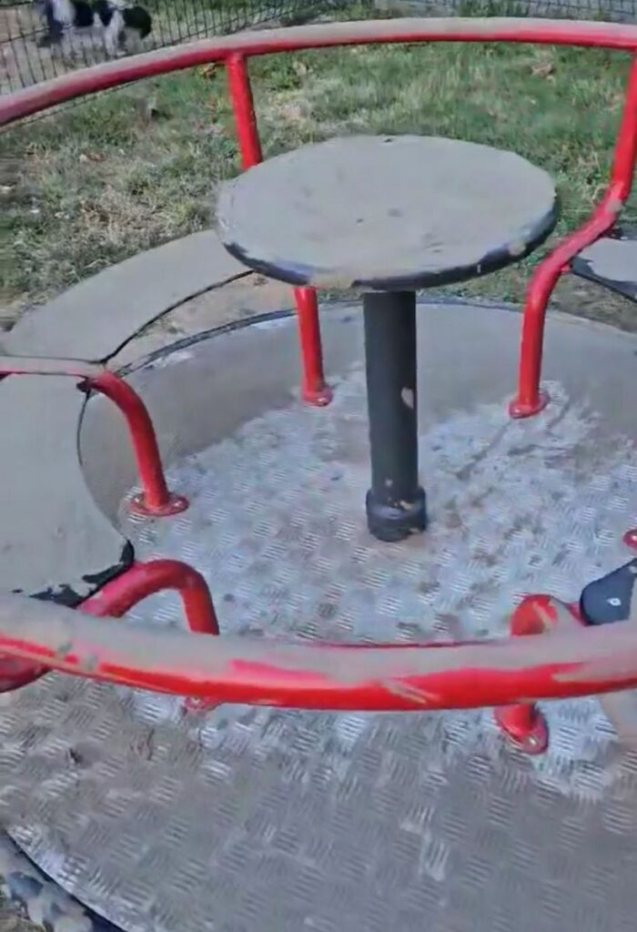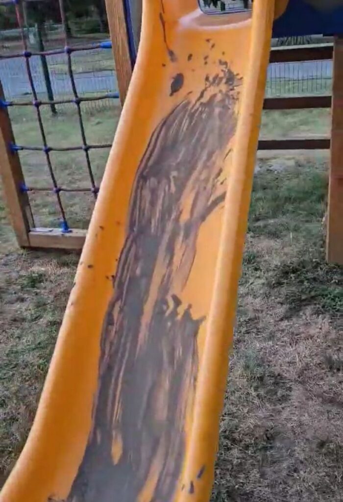 Doslovce sve. Najprije sve klupe za sjedenje, zatim sjedišta na ljuljčkama, kompletan vrtuljak je premazan blatom – sjedišta, upravljač, konstrukcija na kojoj se stoji tijekom vrtnje i ograda vrtuljka. Stradale su i klackalice, a vandali su se posebno posvetili toboganu, pa su blatom dobrano namazali kompletnu plastičnu konstrukciju za spuštanje, sve stepenice, drvenu konstrukciju koja nosi tobogan i hvatišta na ogradama. Temeljito su zablatili i sve konope od kojih se sastoji mreža za penjanje te živopisnog drvenog pijetla kojega najmlađa djeca rado jašu jer se ljulja na velikoj metalnoj oprugi.