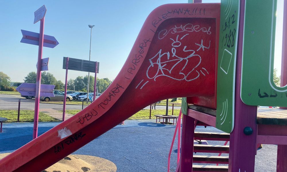 Roditelji, znate li gdje su vam djeca kad se smrači? Znate li da se neki od njih skupljaju na omiljenom dječjem igralištu na Gornjodravskoj obali, gdje u nedostatku bolje zabave izvlače markere i šaraju po spravama. Ispisuju uglavnom žvrljotine, no i vrlo ružne i neprimjerene poruke. Ovdje je godinama unatrag bilo različitih poruka, čak i jedna svastika iscrtana na ogradi male penjalice/tobogana. Trenutno je, uz sve neprimjerene i čudne žvrljotine najupečatljivija ona: “Ubij tovara i Purgera i Rječana!!!”.