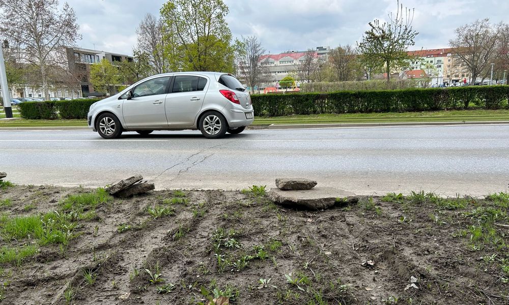 Točno preko puta ulaza u dvoranu Zrinjevac u Reisnerovoj ulici netko je postavio tri velika kamena na zelenu površinu, odmah do rubnjaka koje ju dijele s cestom. Iako je zelena površina zapravo zemlja razrovana kotačima automobila, nekome je očito dozlogrdilo uništavanje trave.