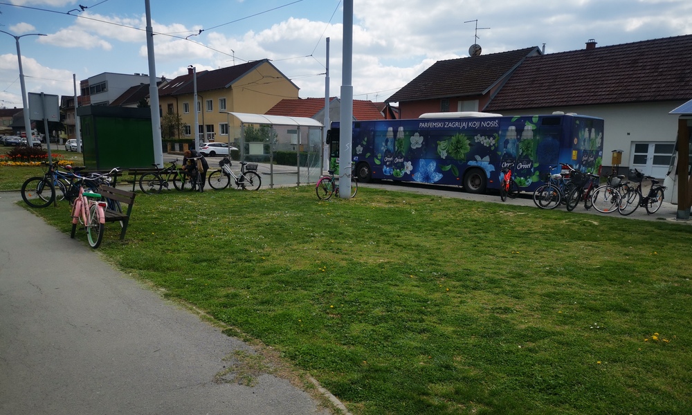 Na ovom prostoru nema niti jednog stalka, ali su zato klupe i stupovi puni zavezanih bicikala. Osim što biciklu nije mjesto uz rasvjetni stup ili klupu, građani riskiraju da ostanu brz svog prijevoznog sredstva, jer na klupama (koje služe kao stalci) gotovo uvijek je gužva, pa mnogi bicikle ostave na nogostupu uz stanicu s električnim biciklima.