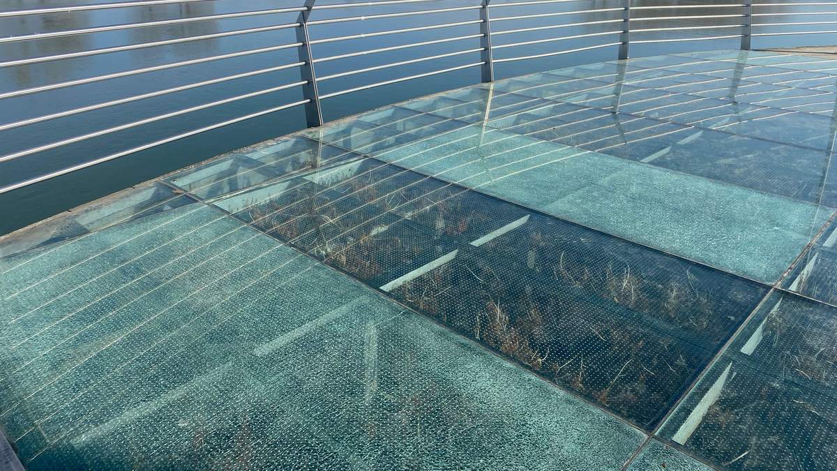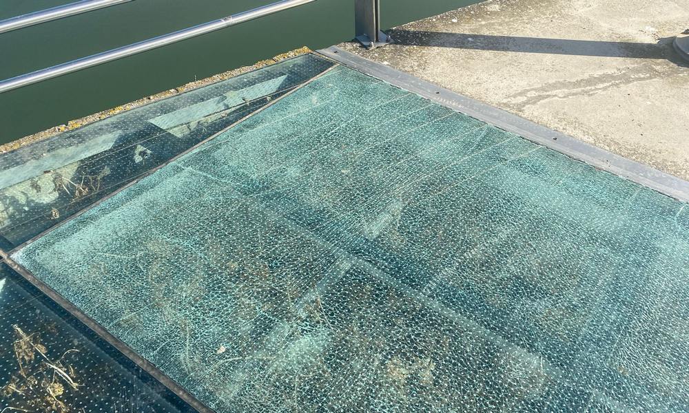 Ovdje je za lijepoga vremena puno šetača, a mnogi se i zadržavaju uz zaštitnu ogradu jer je pozicija atraktivna i pruža se predivan pogled na lijevu obalu. Prva puknuća podnih staklenih površina pojavila su se već godinu ili dvije nakon što je vidikovac instaliran i tada se nitko nije naročito uzbuđivao zbog toga. U redu, vjerojatno su stakleni blokovi dovoljno debeli da u tom trenutku puknuća nisu predstavljala ozbiljniju prijetnju šetačima. No, danas, deset godina kasnije čak ni onima koji ovdje prolaze svakoga dana zapravo više nije svejedno. Cijele ploče ozbiljno je nagrizao zub vremena ili su uništene iz nekog drugog razloga (zbog temperaturnih razlika ljeti i zimi ili zbog toga što ih je netko mehanički oštećivao).