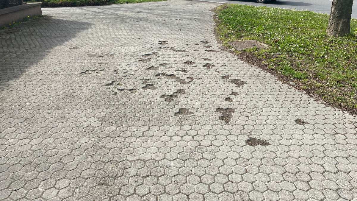 Iz relativne daljine to izgleda kao neka umjetnička instalacija u prostoru, ali naravno da nije riječ o nikakvom kreativnom procesu nego ovdje naprosto nedostaju dijelovi pločnika. Sugrađani koji su nas pozvali kažu kako se to događa već neko vrijeme i kao da netko organizirano dolazi pa s vremena na vrijeme izvadi nekoliko komada i prazninu zatrpa zemljom. Onda se neko vrijeme ne događa ništa, pa kad vide da nitko nije popravljao – onda opet nestane još nekoliko komada.