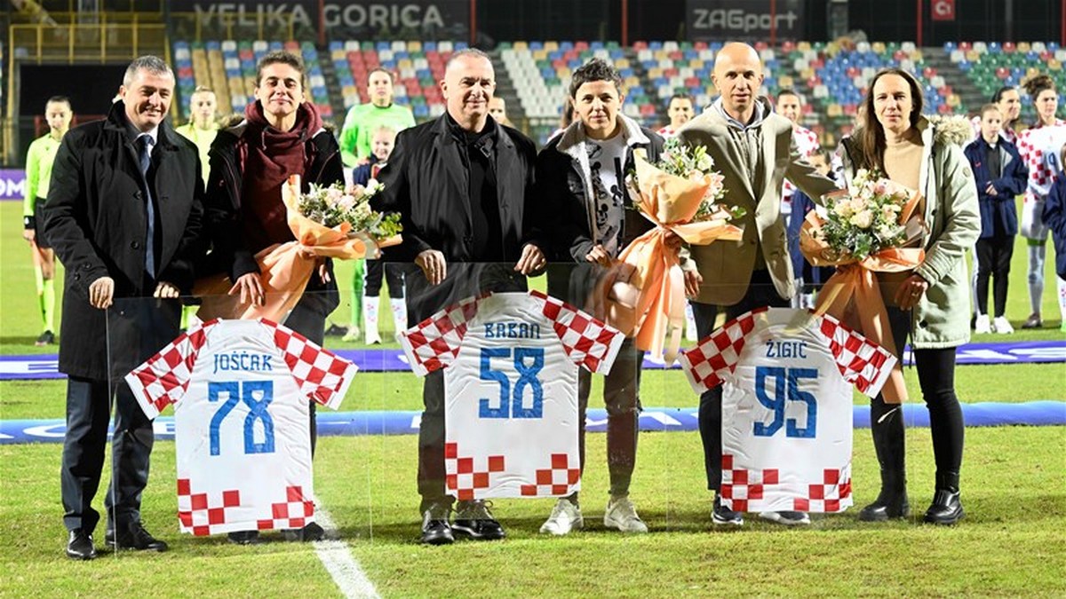 Bukete cvijeća i uokvirene dresove s brojem nastupa u državnoj izabranoj vrsti primile su Sadra Žigić (za 95 nastupa), te Osječanke Maja Jošćak (78) i Violeta Baban-Barbika (58). I dok su Jošćak i Baban cijelu karijeru provele u dresu najboljeg ženskog hrvatskog nogometnog kluba, Žigić je kratko nastupala na „Mačkamami“.