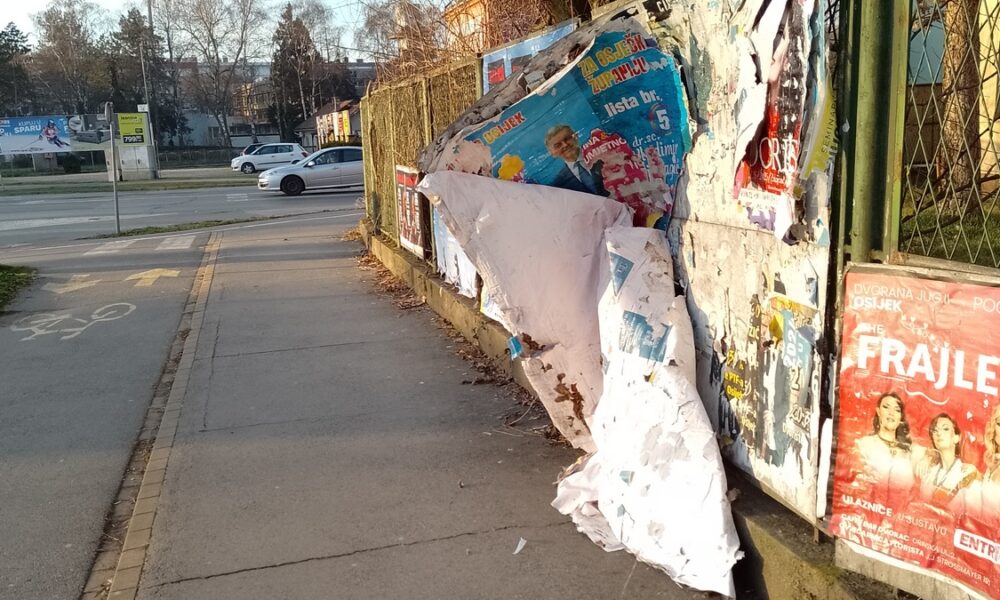 Pod težinom zalijepljenih plakata nosač visi preko pola staze