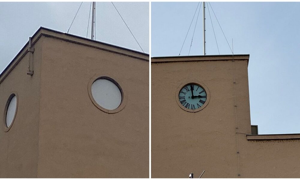 Okrugli prozori zatvoreni su pleksiglasom i noću svijetle dok je satni mehanizam na popravku
