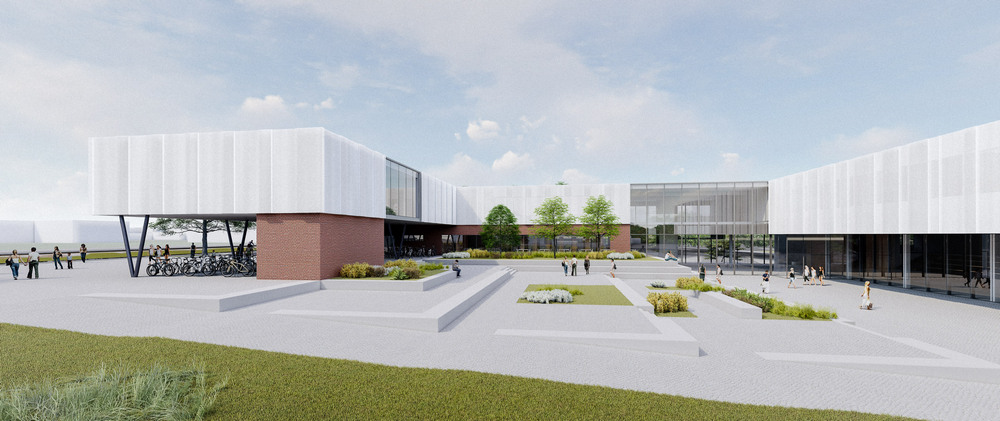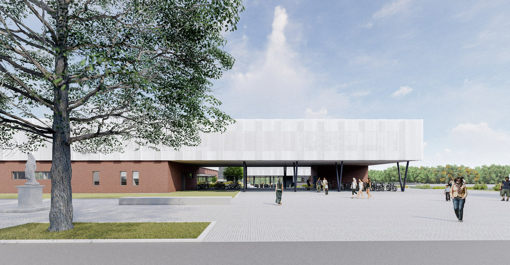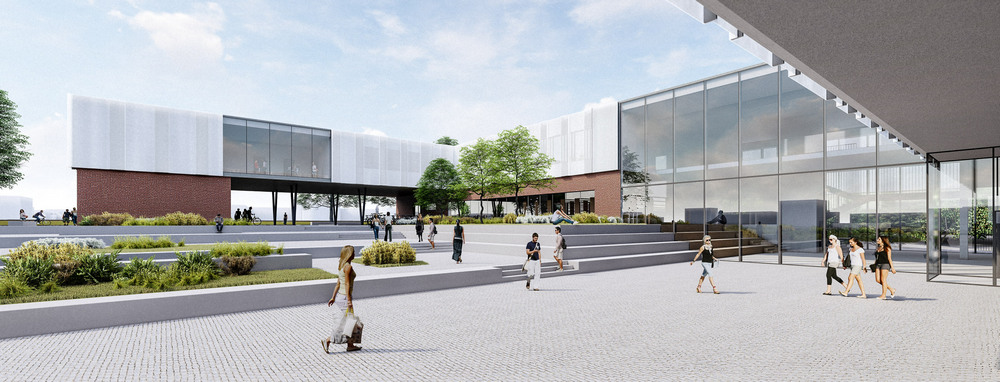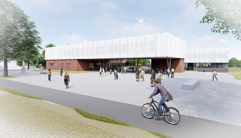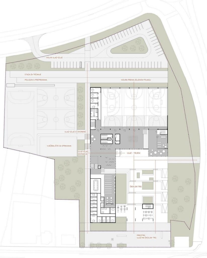 Glavni pješački ulaz planiran je s južne strane parcele s novoformirane javne površine – trga uz Strossmayerovu. Glavni kolni ulaz planiran je sa sjeverne strane iz novog produžetka Kanižlićeve ulice, a uz zgradu gimnazije planirano je i 78 parkirališnih mjesta.