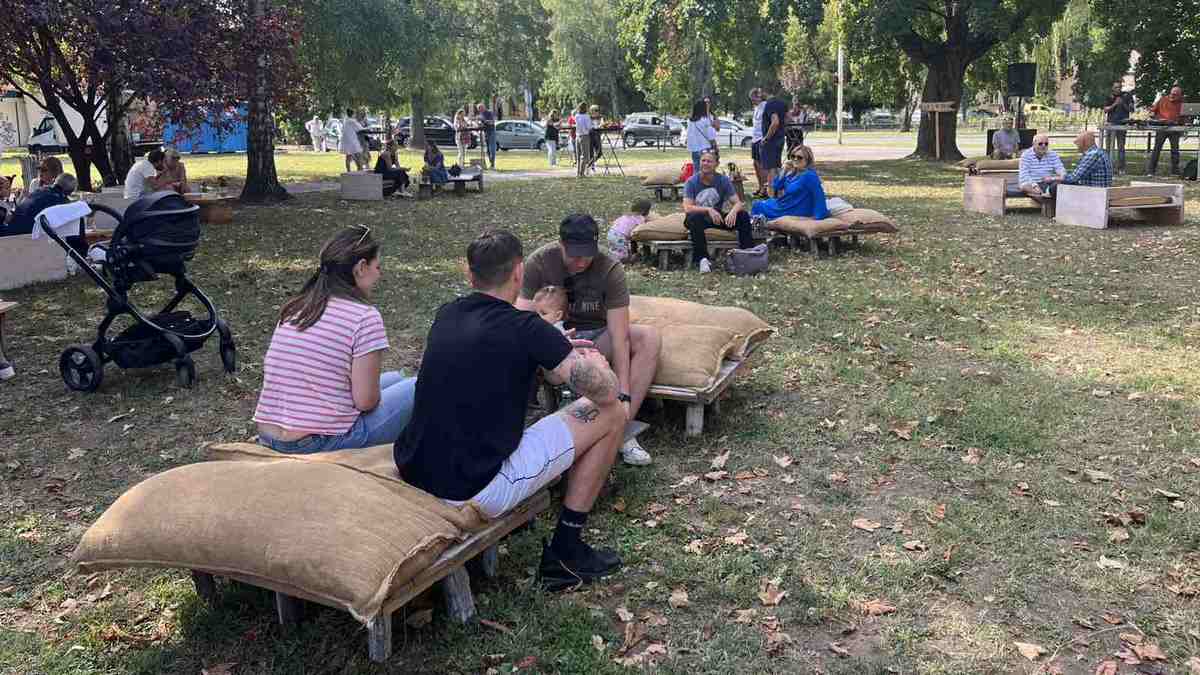 Neki su došli u klasičnu subotnju kupnju na tržnici, a neki su u isto vrijeme ciljano došli sjesti na sofu u obližnji Park Svetišta srca Isusova, prigristi nešto i poslušati mjuz. A ona su ovi prvi također pogledali što se događa u parku, a ovi iz parka su iskoristili lijepo vrijeme, pa su pogledali ponudu na tržnici.