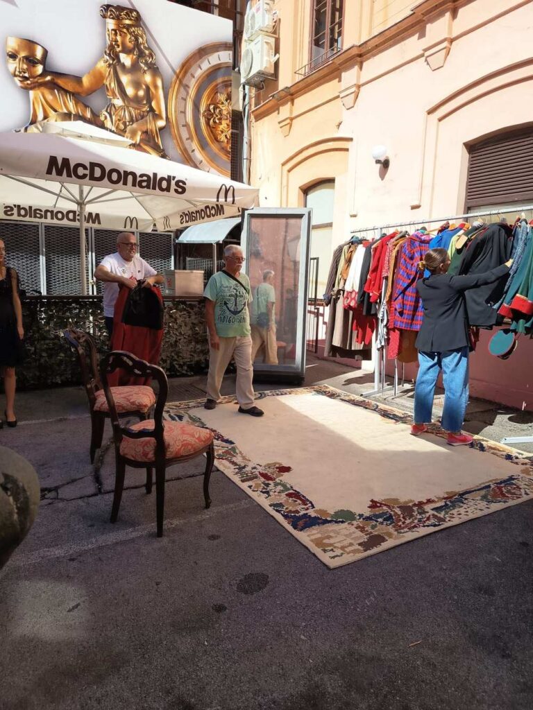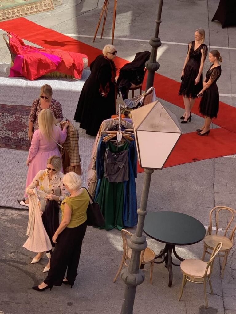 Od podneva je u kazališnom dvorištu u tijeku prigodna prodaja viška kostima iz nekadašnjih drama i opera. Odmah su se pojavili i prvi ozbiljni kupci koji temeljito prečešljavaju izloženu robu. Među njima je najviše žena, one se temeljito koncentriraju na pojedine komade odjeće, pregledavaju svaki detalj, a povremeno opušteno i isprobavaju neke jednostavnije kreacije koje se mogu zaogrnuti.