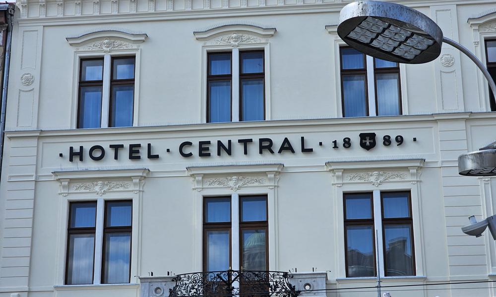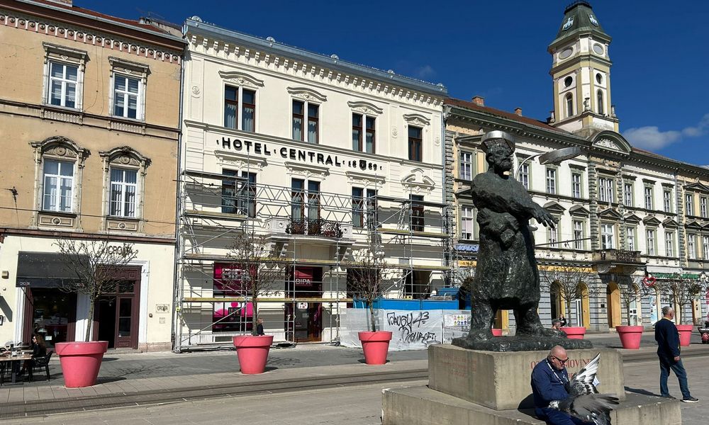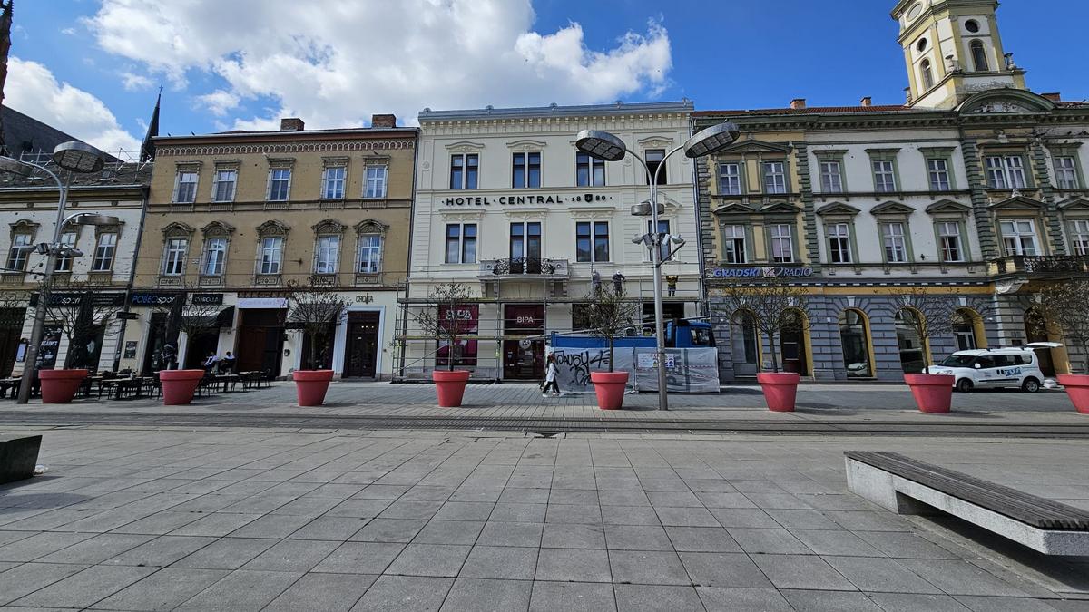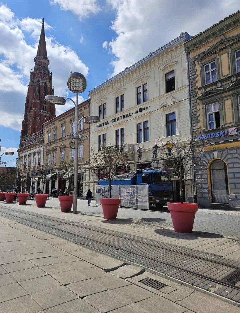 Sada je konačno vidljivo kakve je boje novoobnovljeni, inače najstariji gradski hotel Central. Nježna bež nijansa sada dominira glavnim gradskim trgom i na prvu izgleda baš lijepo, decentno i umirujuće. Posebno se ističu velika slova CENTRAL i godina 1889.