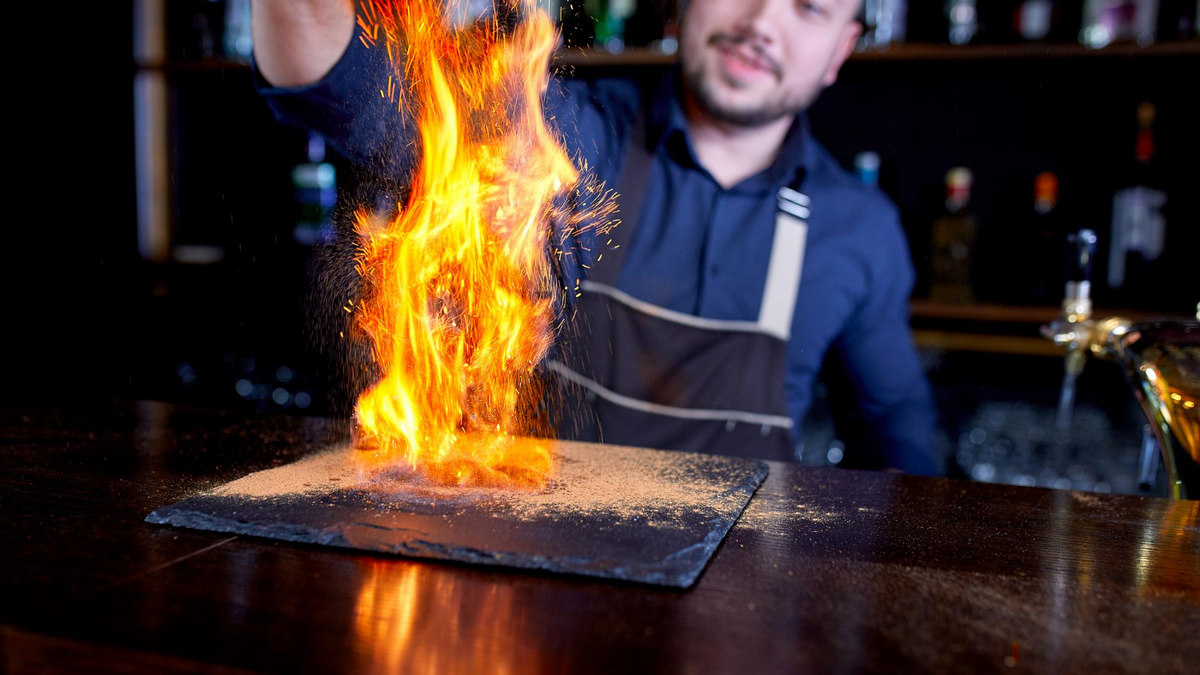 Uglavnom, jedan od konobara zamolio je šefa da ovaj puta on servira diplomatsku poslasticu. Dobio je odobrenje i dao se na posao. U početku je sve štimalo, kolica s palačinkama je zaustavio kod stola s gostima, zapalio je rum, ali se prilikom prelijevanja palačinki jedan dio zapaljene tekućine razlio po nadstolnjaku na kolicima. Isprva konobar nije primijetio vatru jer je bio koncentriran na serviranje, a kad je shvatio što je napravio – naprosto je tiltao. Podigao je ruke u visini ramena i ukipio se, ne znajući što da radi. No, to je samo povećalo problem jer se dio zapaljive mase počeo razlijevati i po njegovim rukama, pa je u panici odbacio hvataljke i šokiran se gotovo dao u bijeg.