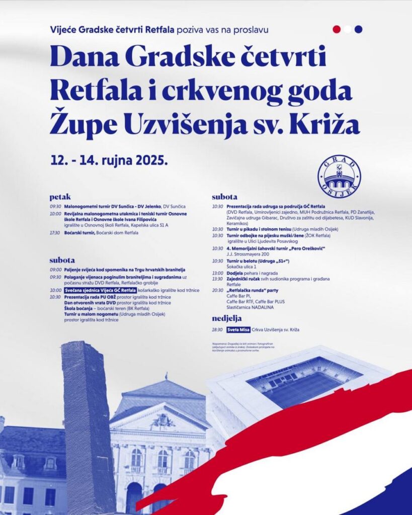 – U 10 sati održat ćemo svečanu sjednicu Vijeća GČ Retfala na igralištu kod tržnice, gdje će građanima svoj rad predstaviti i sve udruge s područja Retfale – DVD Retfala, Umirovljenici zajedno, MUH Podružnica Retfala, PD Zanatlija, Zavičajna udruga Gibarac, Društvo za zaštitu od dijabetesa, KUD Slavonija, Keramikos. Program se u 10,30 sati nastavlja turnirom u pikadu i stolnom tenisu, turnirom odbojke na pijesku, Memorijalnim šahovskim turnirom „Pero Orešković“ i turnirom u belotu. U 13 sati slijedi podjela pehara i nagrada, te zajednički ručak svih sudionika programa i građana Retfale – ističe Marko Eljuga, predsjednik GČ Retfala.